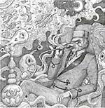 "Navigating by Starlight is the elegantly distended fourth LP by a New York band known for its fine taste in bourbon as well as its ability to explore strangely forested nooks of space. Composed of two side-long excursions of heavily bearded improv, this is what Bruce Dern should have been listening to throughout Douglas Trumbull's Silent Running. The first side is called 'Lovejoy Vapor Trail,' after the recently discovered comet said to be releasing enough alcohol to fill 500 bottles of George T. Stagg every second. Who could fail to be staggered by such a suggestion? Not these guys. Dave Shuford's guitar vomits stars in all known directions, Jimy SeiTang's bass and synth cover the proceedings with a blanket of darkness, and Rob Smith's drums drive things along like a pulsar. The flip, 'Scylla and Charybdis,' continues Rhyton's linguistic love affair with Ancient Greece. But with Shuford on electric mandolin, and the rhythm section picking their way between the twin threats more carefully than usual, the band creates a vibe that is more space-swamp than whirlpool (at least in this writer's opinion). By which I mean its method of sucking you into its vortex is staggered rather than continuous. Of course, once you've stuck your head into Rhtyon's sound-barrel, the specifics of destruction don't matter much do they? 500 bottles of Stagg a second . . . that would sure take care of the world shortage, wouldn't it?" --Byron Coley